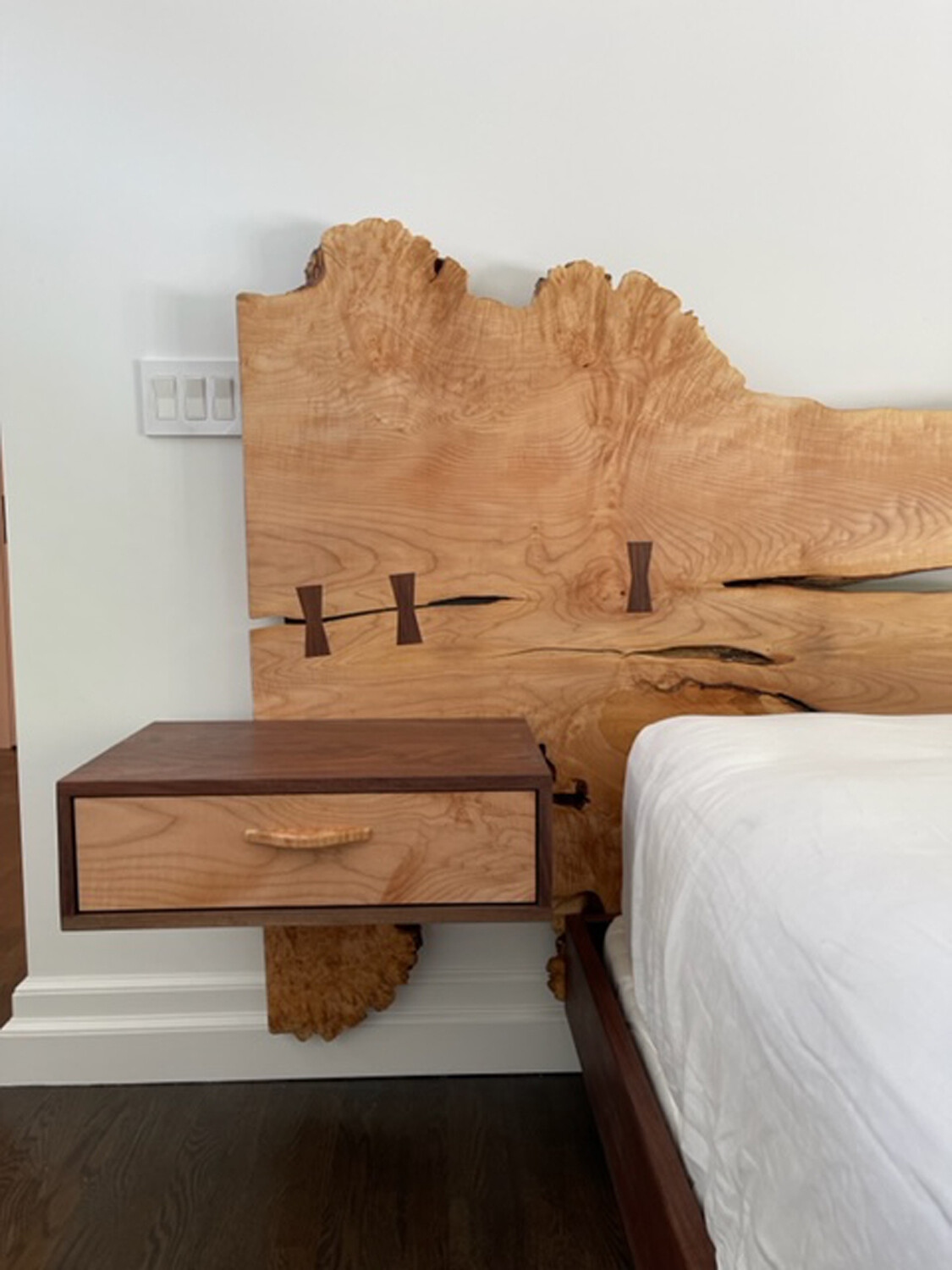 A live edge bed made from a big leaf maple slab